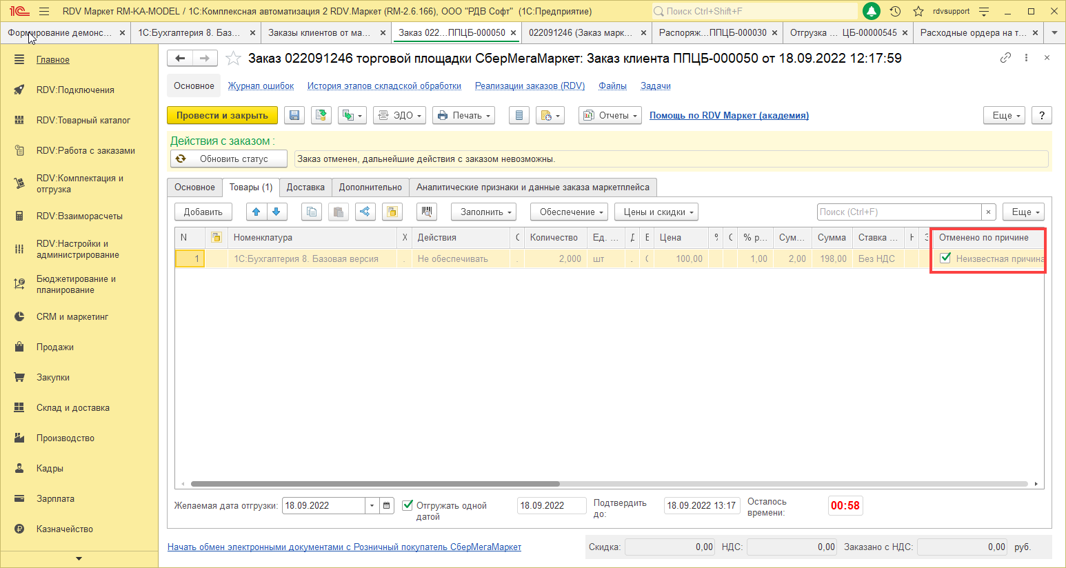 2. Заказ отменен после упаковки, до отгрузки