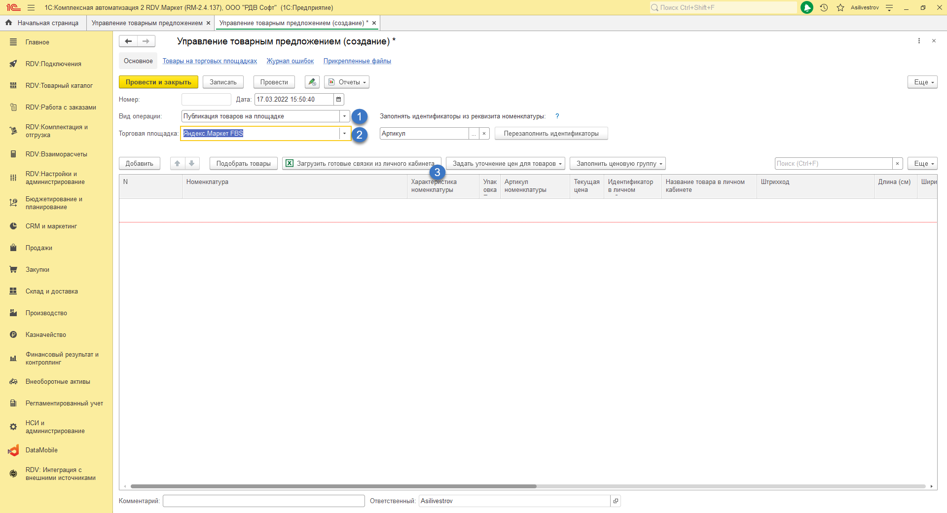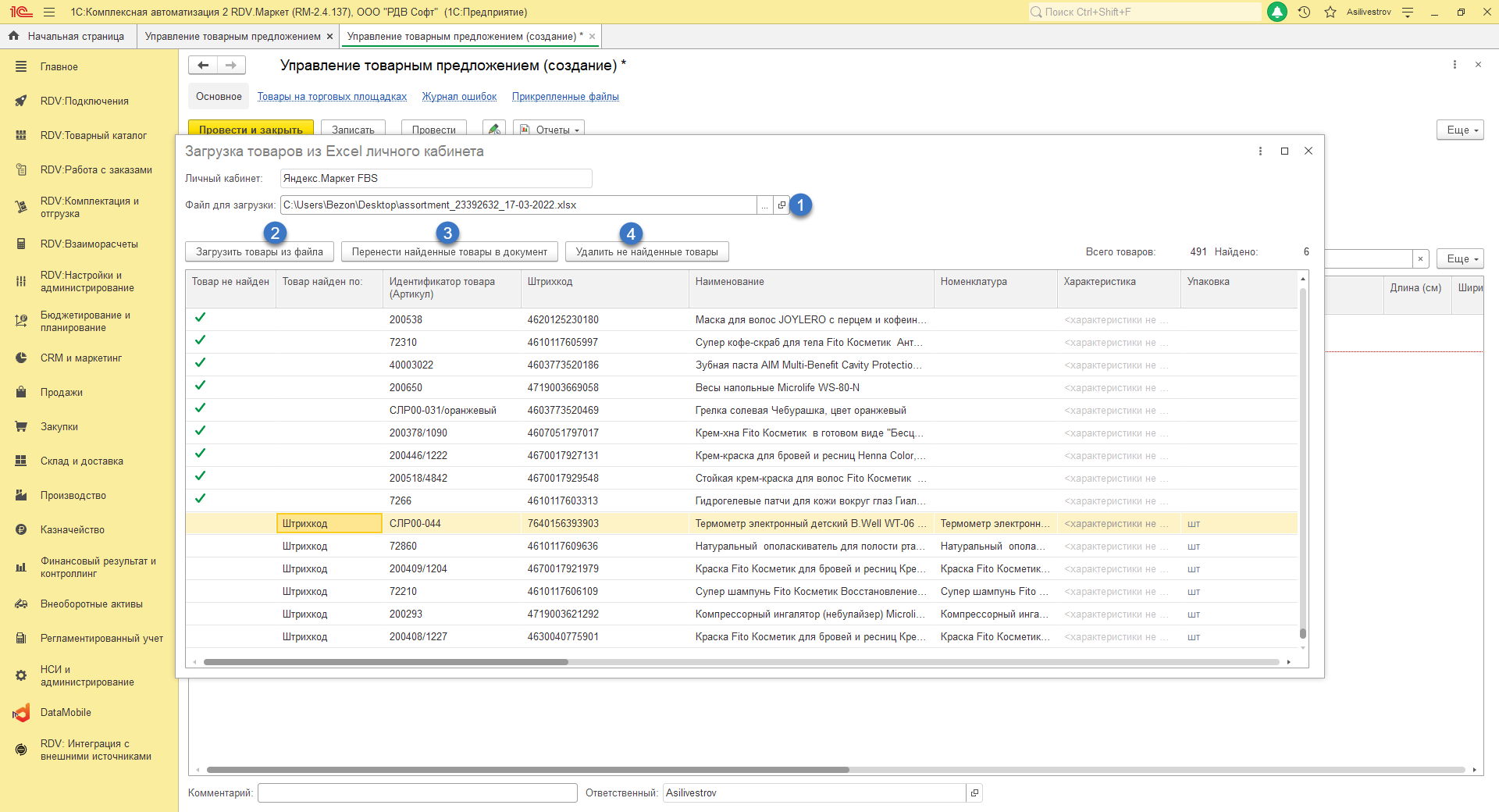 Перед переносом товаров в документ проверьте корректность сопоставления товаров маркетплейса (колонка "Наименование") с номенклатурой в 1С (колонка "Номенклатура") Загружать внешний файл в документ УТП необходимо при работе через тонкий клиент