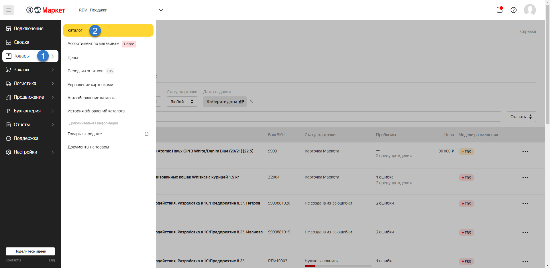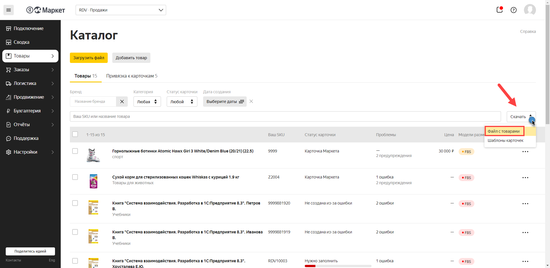 1. Для загрузки готовых связок необходимо выгрузить файл с данными о товарах. Он доступен для загрузки в личном кабинете в разделе "Товары" - "Каталог":