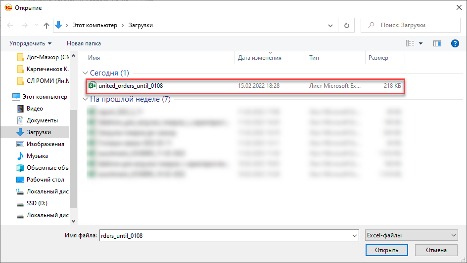 Данные по заказам из файла загрузится в табличную часть.