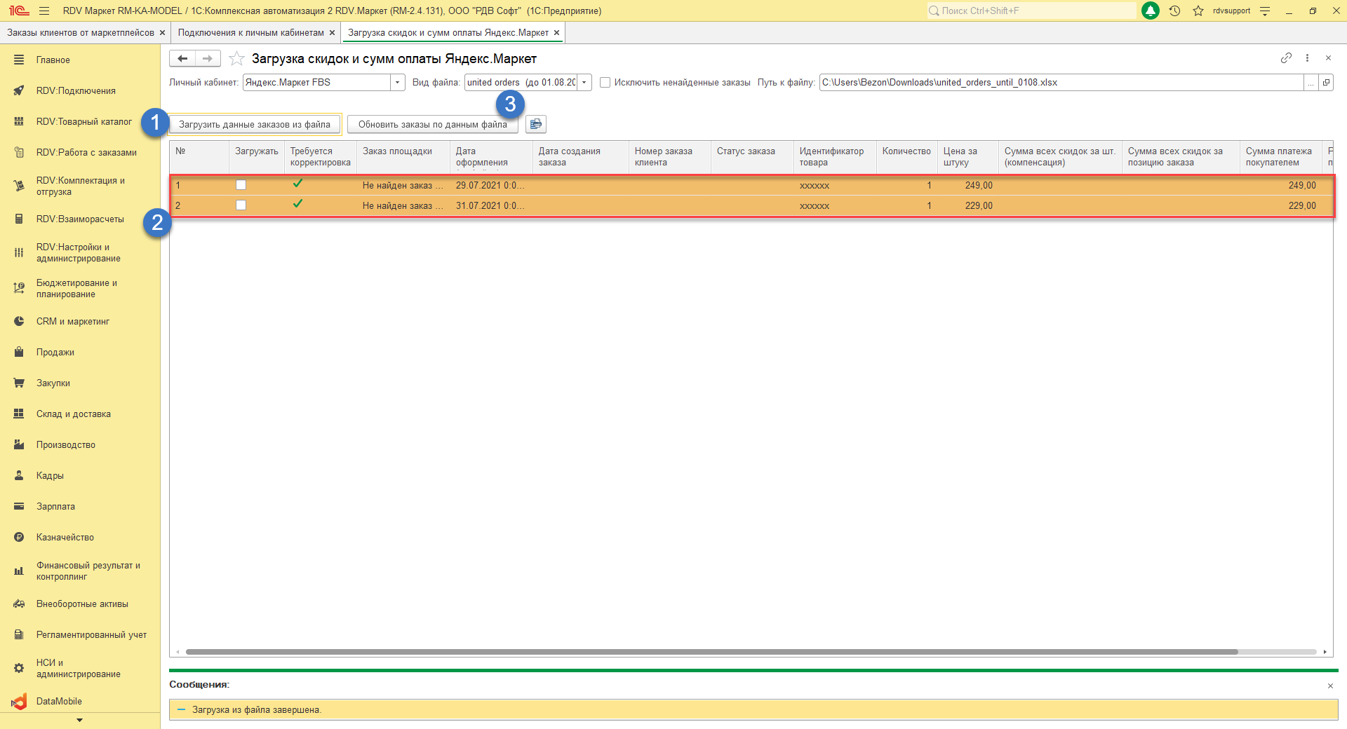 Нажать на кнопку "Обновить заказы по данным файла".