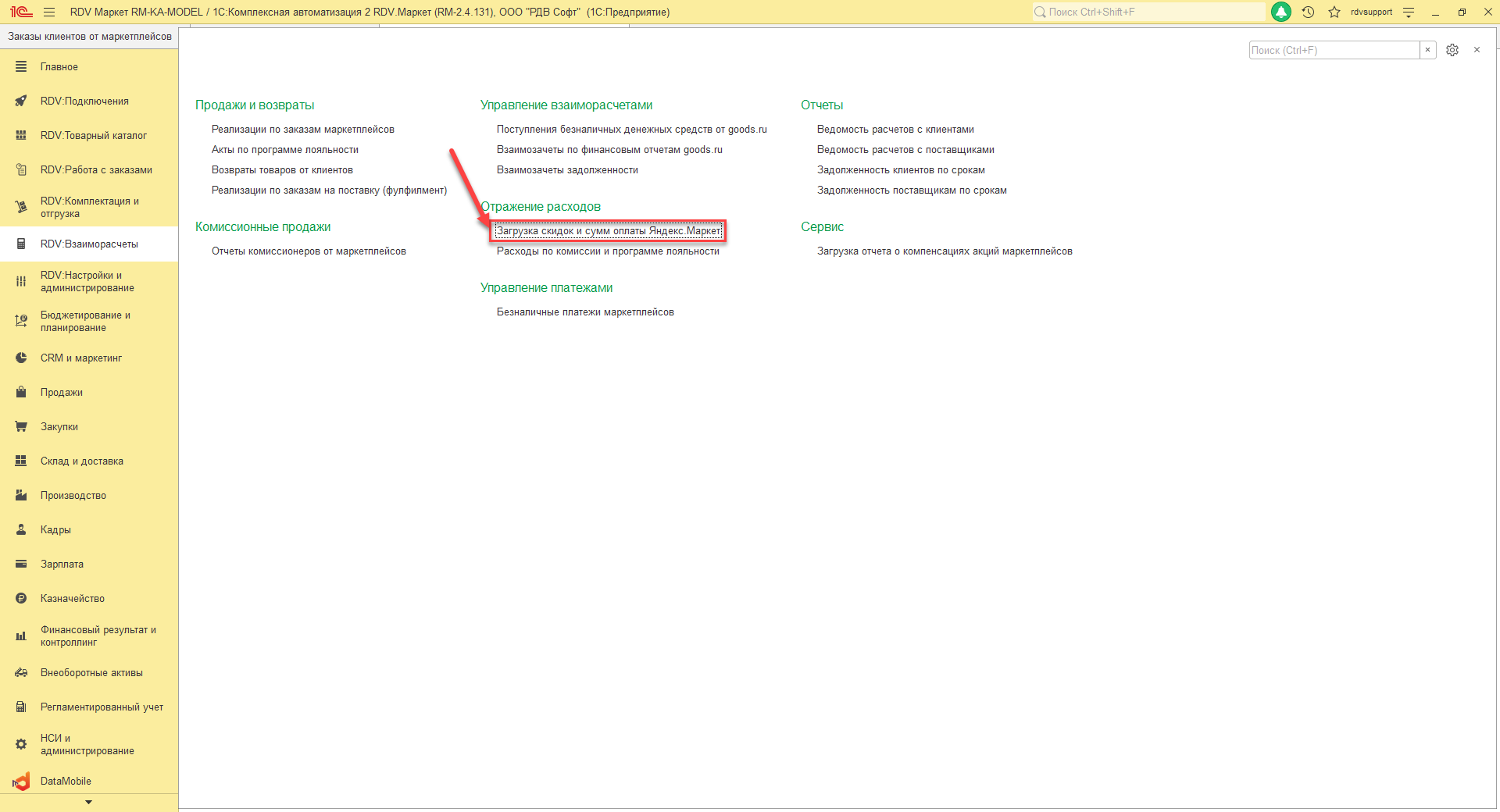 Маркетплейс Яндекс.Маркет не передает по API данные о скидках. Для отражения данных скидок в системе 1С необходимо перейти: "RDV:Взаиморасчеты" - "Загрузка скидок и сумм оплаты Яндекс.Маркет"