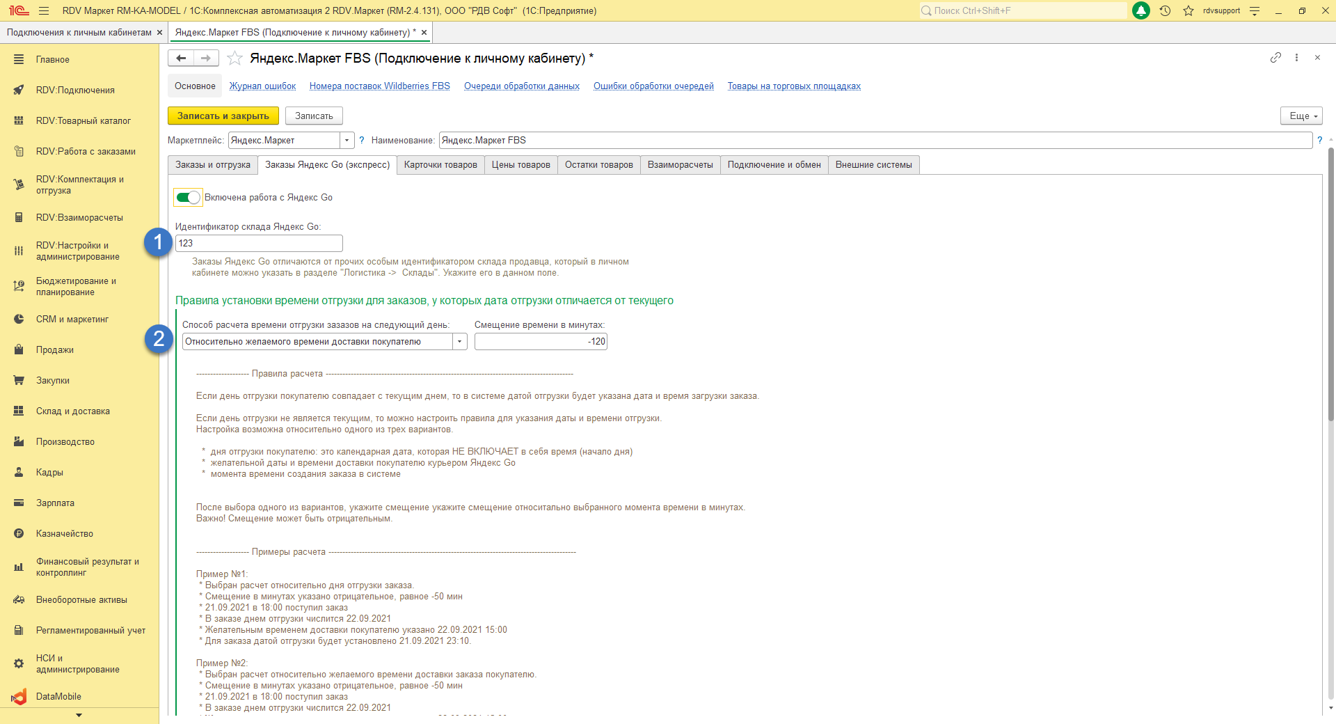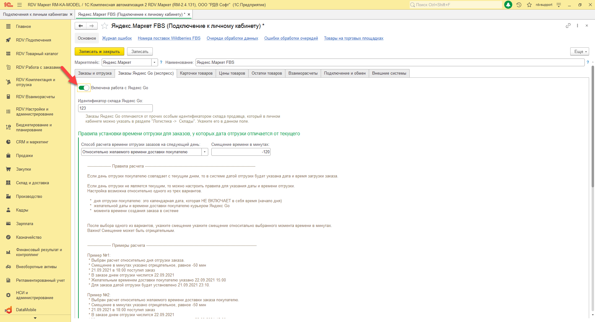 Для определения признака заказов Яндекс GO, необходимо перейти "RDV: Подключения"-"Подключения к личным кабинетам"-"Яндекс Маркет FBS". Во вкладке "Заказы Яндекс GO (экспресс)" включаем признак "Включена работа Яндекс GO".