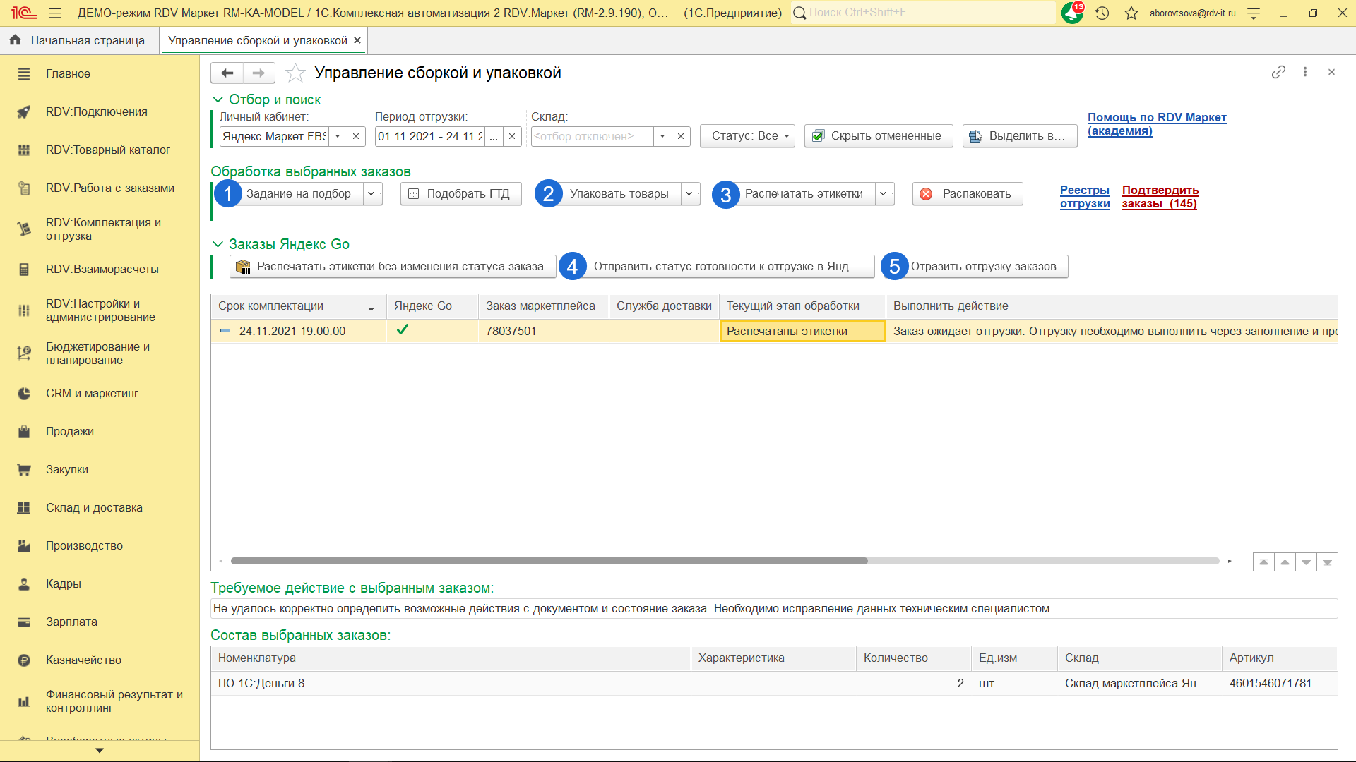 - Отправить на маркетплейс информацию о готовности заказа к отгрузке по кнопке "Отправить статус готовности к отгрузке в Яндекс". После нажатия на данную кнопку, маркетплейс начнёт поиск курьера для доставки заказа.