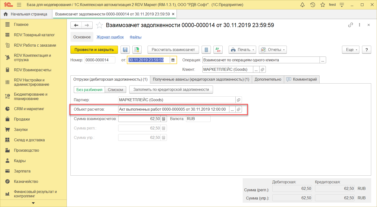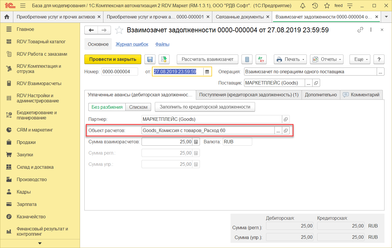 В списке вы найдете проведенный документ "Взаимозачет задолженности"