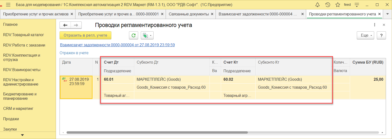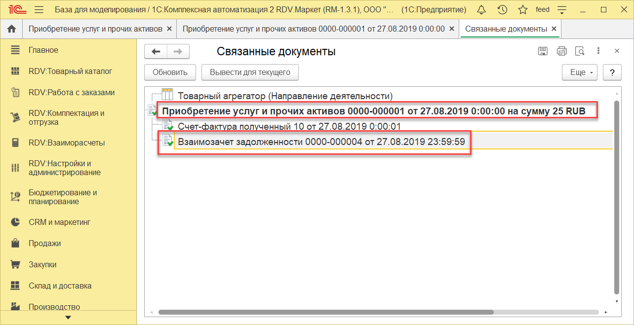 Для просмотра документа Взаимозачет задолженности и проводок, нужно зайти в Приобретение услуг - "Отчеты"- "Связанные документы".
