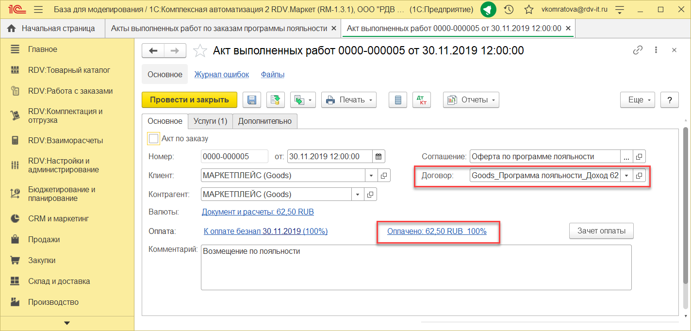 - отразить реализацию услуг программы лояльности за отчетный период (месяц)