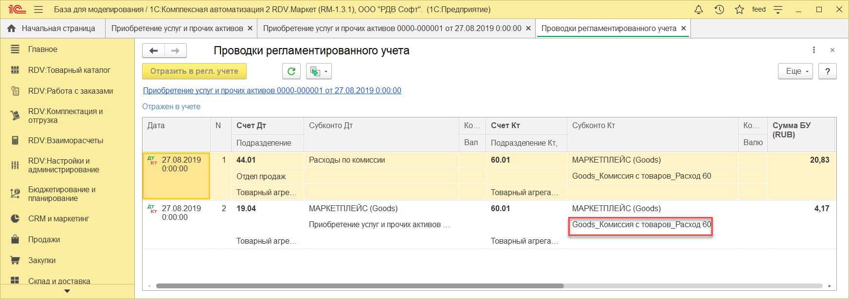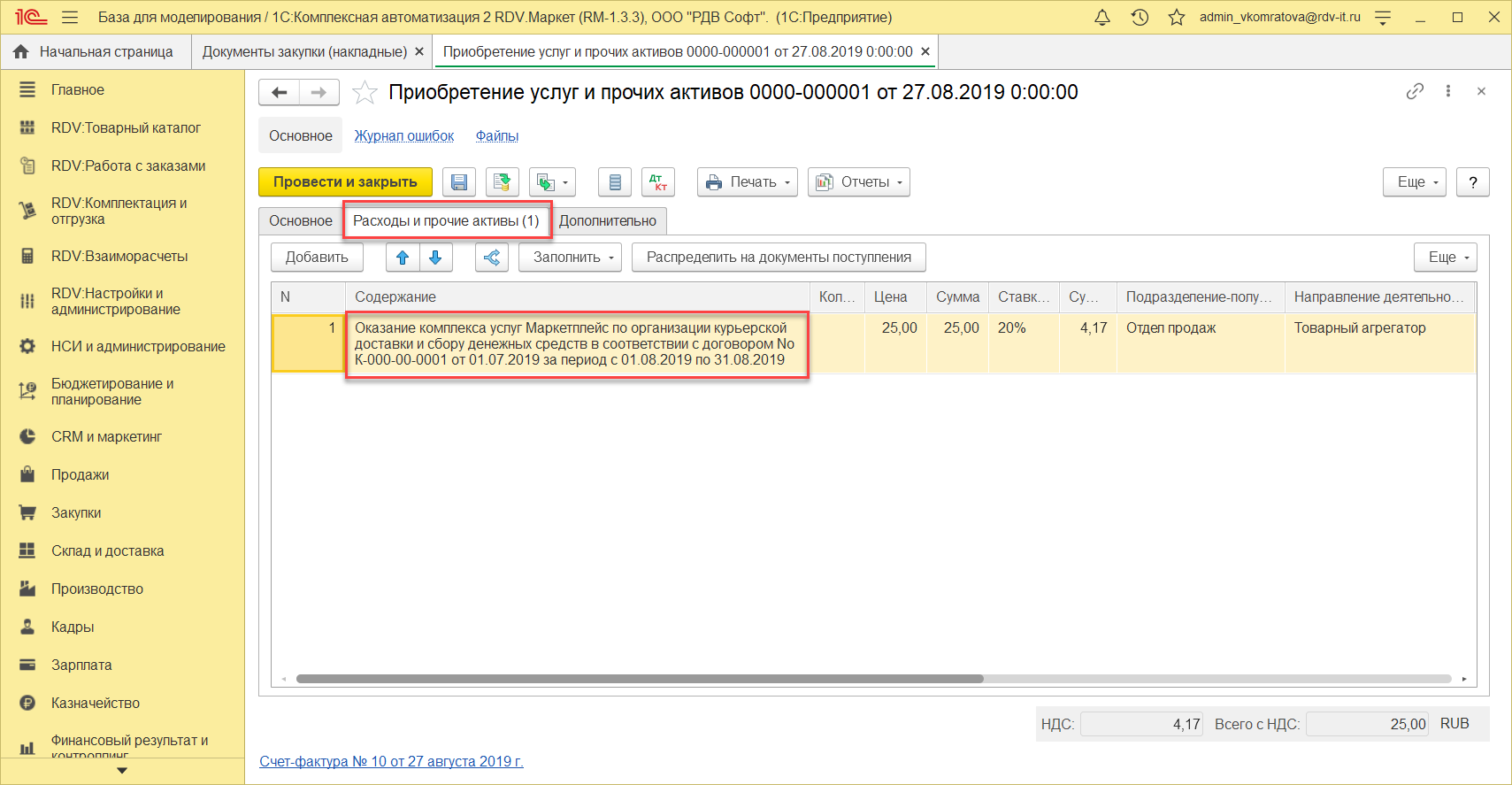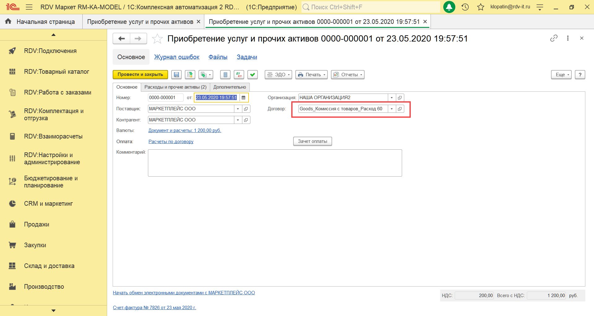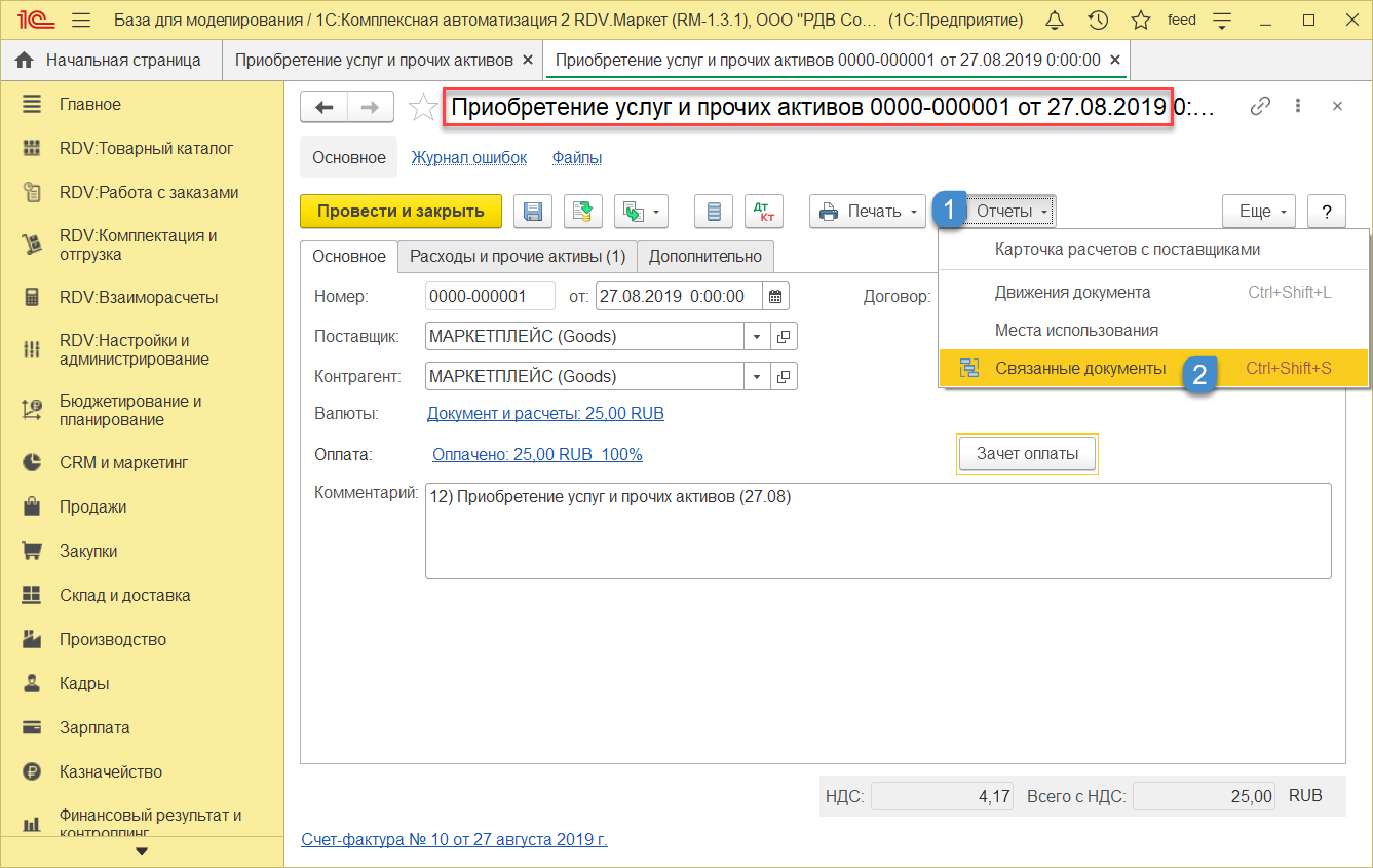 Отражение услуги СММ по комиссии, формирование документа "Поступление услуг и прочих активов" и "Счет-фактура"