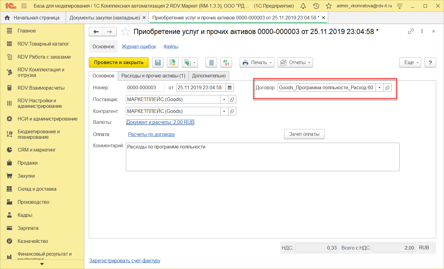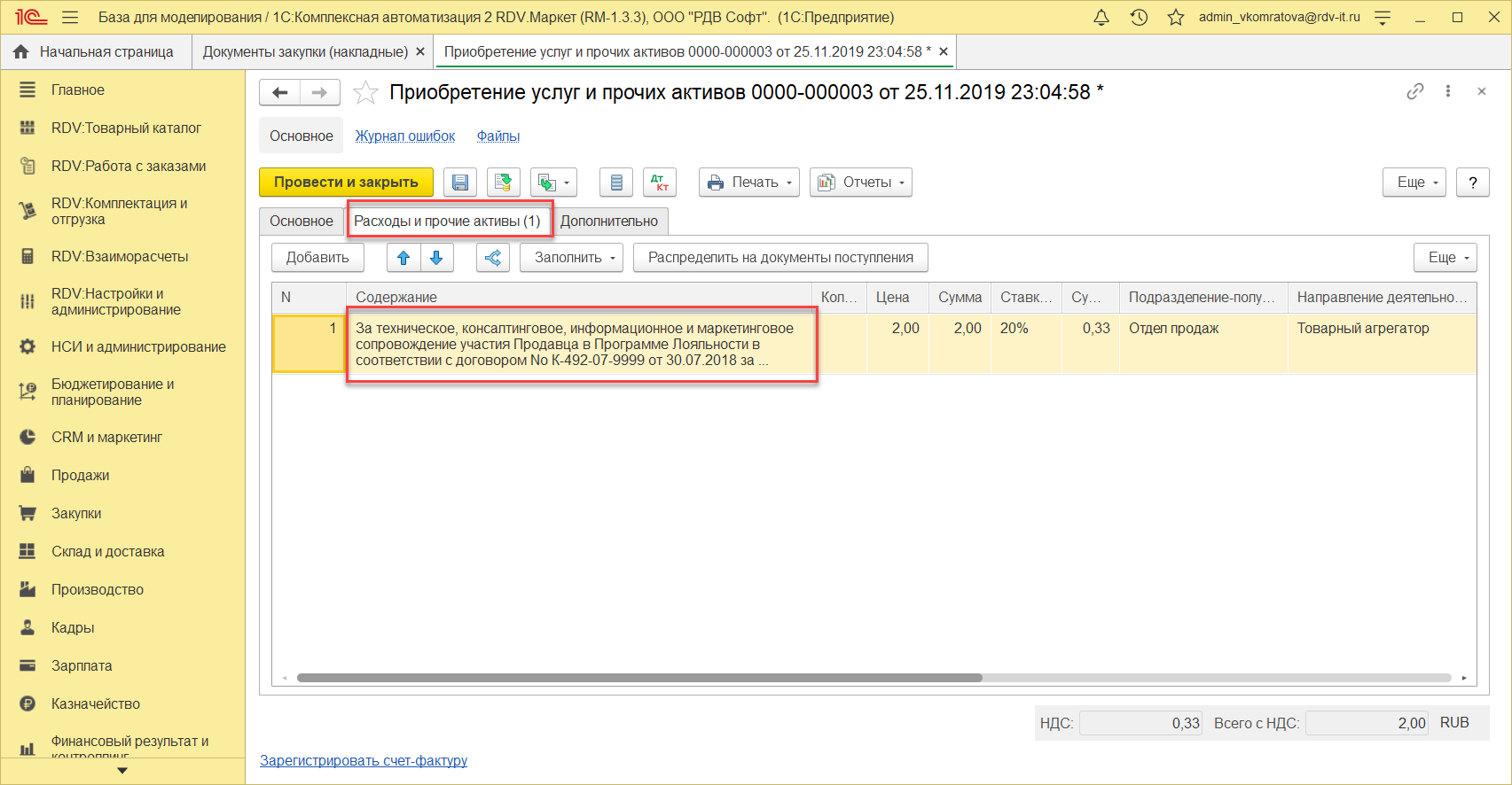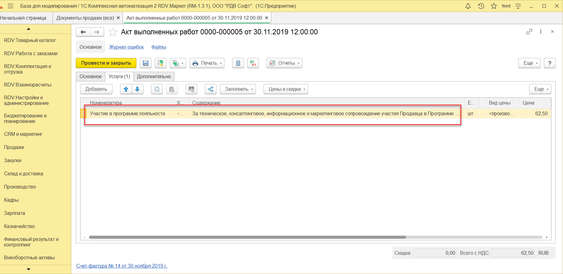 Отражение услуги СММ по комиссии, формирование документа "Поступление услуг и прочих активов" и "Счет-фактура"