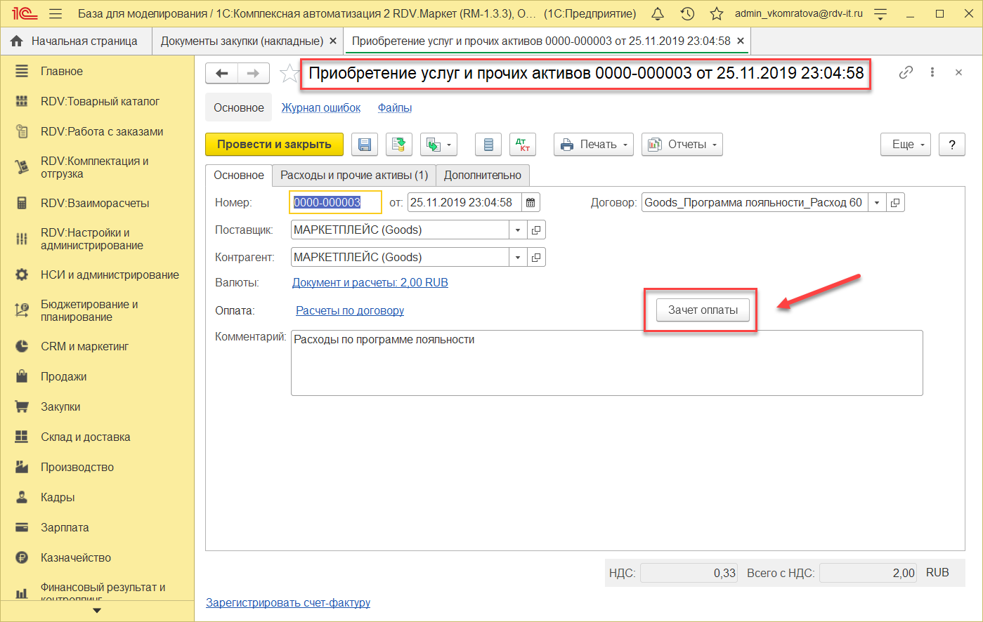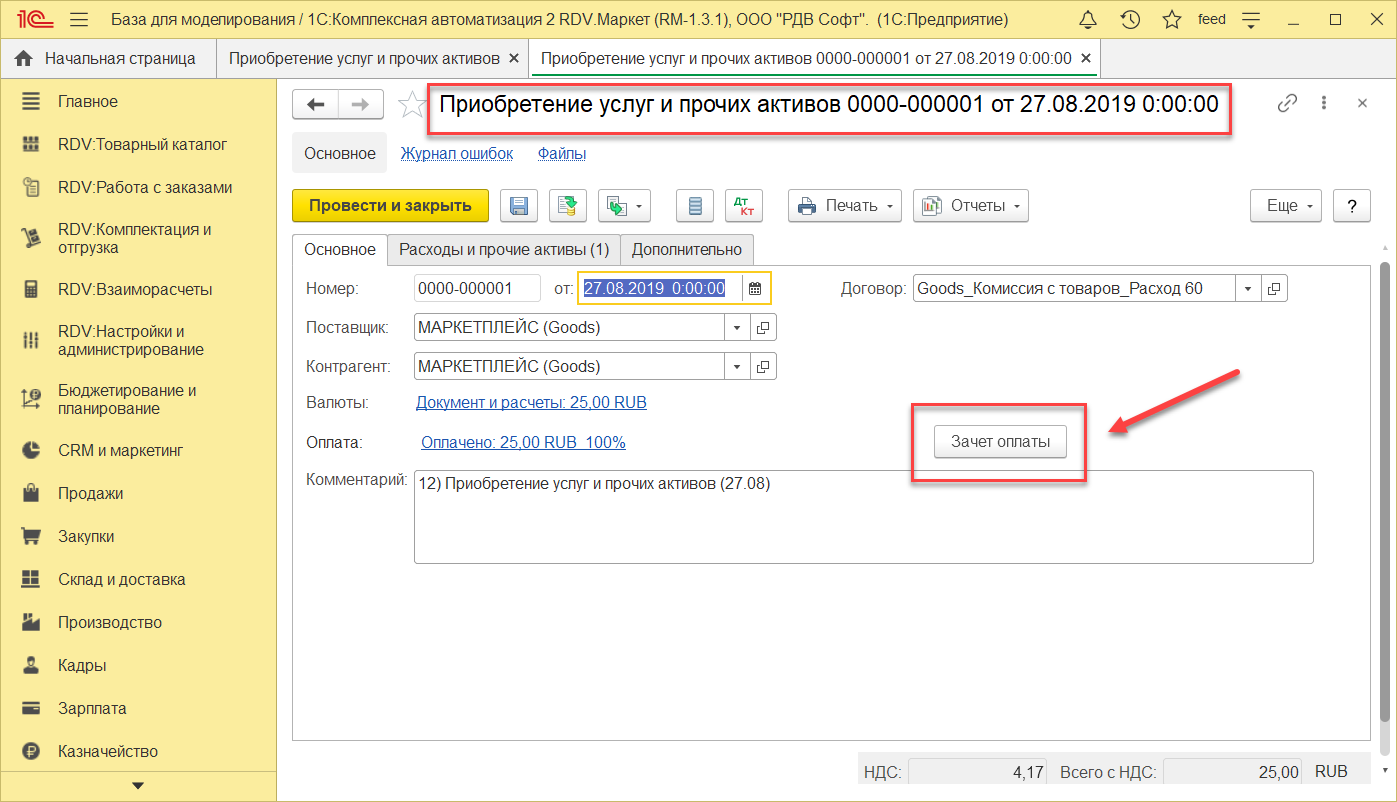После формирования Приобретения услуг, мы можем сформировать документ взаимозачет аванса. Для этого нажимаем на "Зачет оплаты".