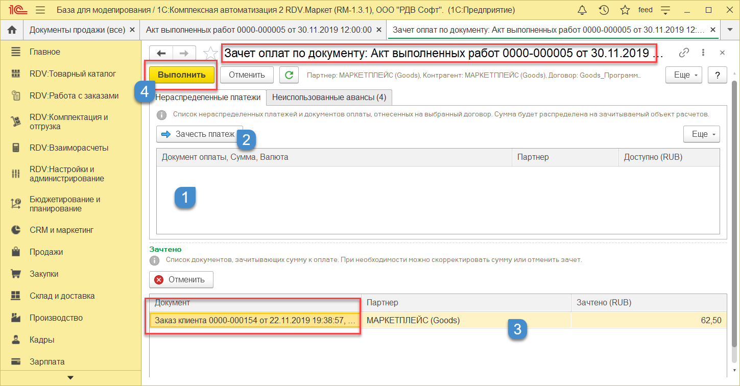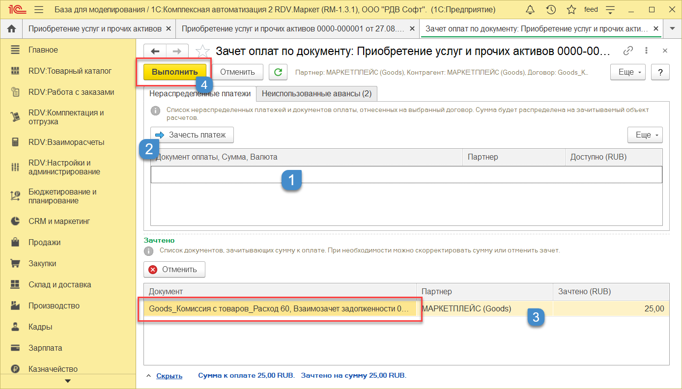 В документе показаны данные для зачета (1). Нужно выбрать нужные строки с документами, по которым нужен зачет и нажать кнопку "Выполнить". (2)
