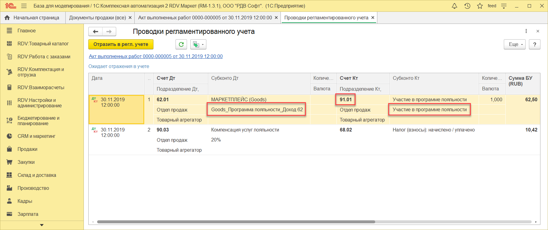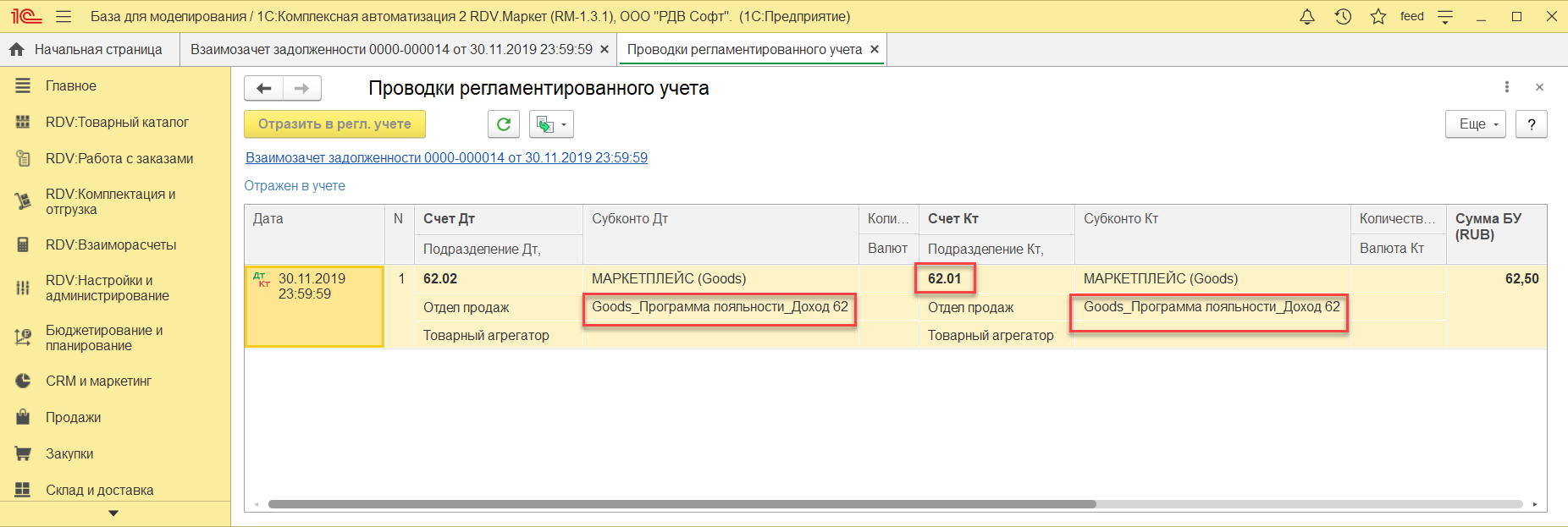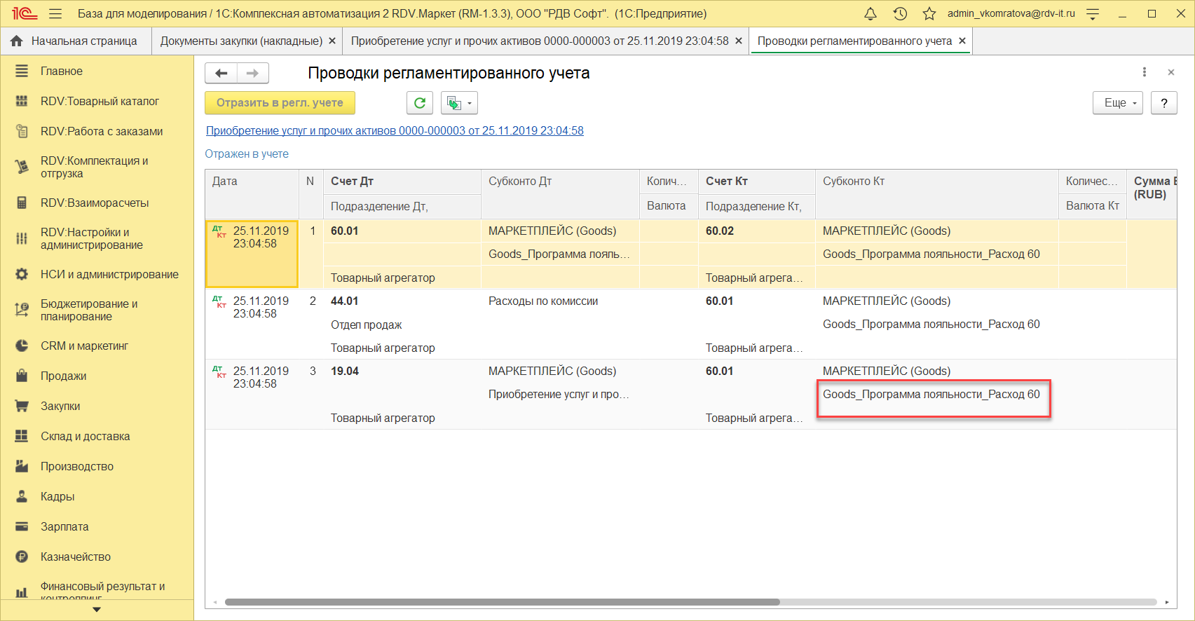 - отразить расход по вознаграждению goods.ru по программе лояльности за отчетный период (месяц)