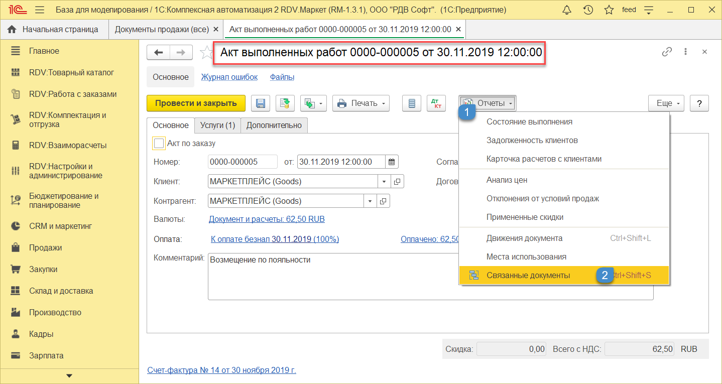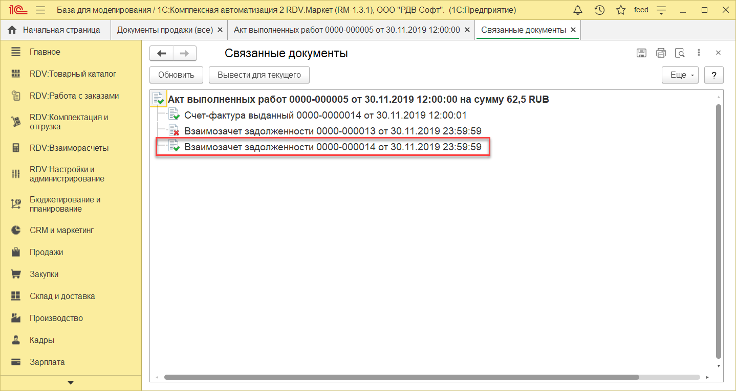 Для просмотра документ Взаимозачет задолженности и проводок, нужно зайти в Акт выполненных работ - "Отчеты"- "Связанные документы".
