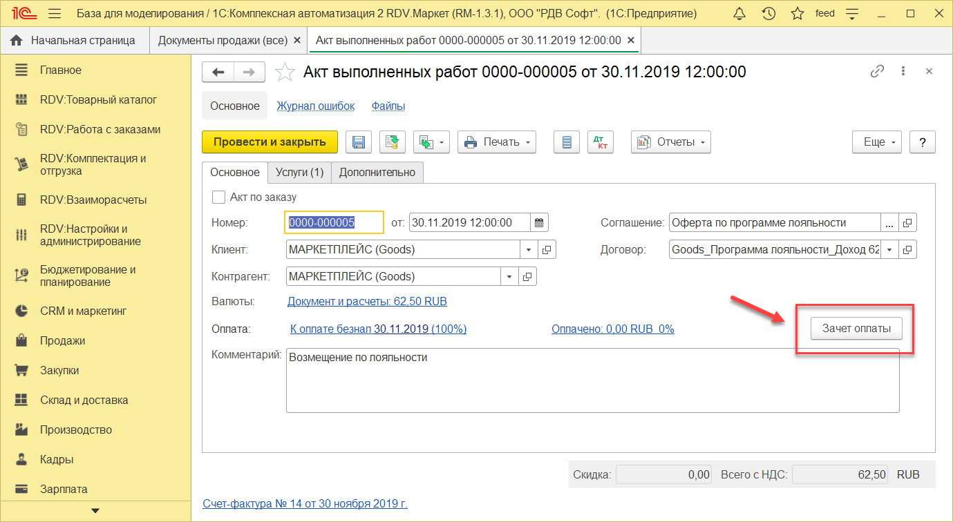 После формирования Акта о выполненных работах в системе, мы можем сформировать документ взаимозачет аванса. Для этого нажимаем на "Зачет оплаты".