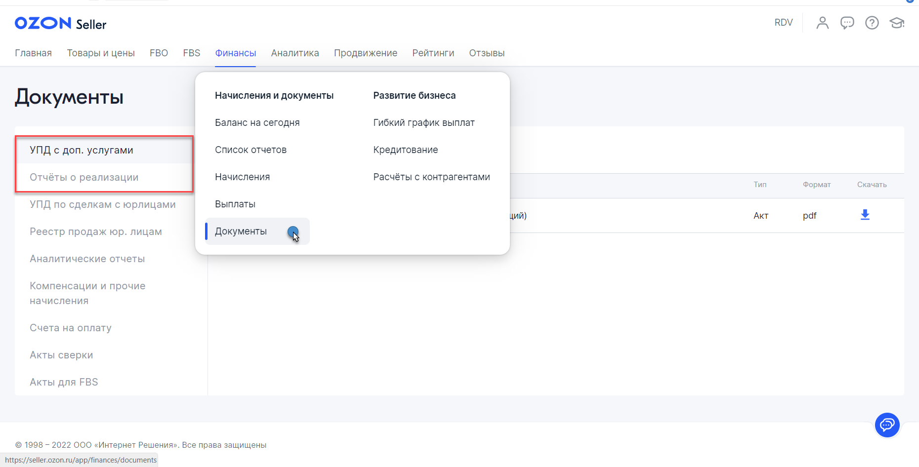 Все документы вы можете найти в личном кабинете Ozon, в разделе "Финансы" → "Документы".